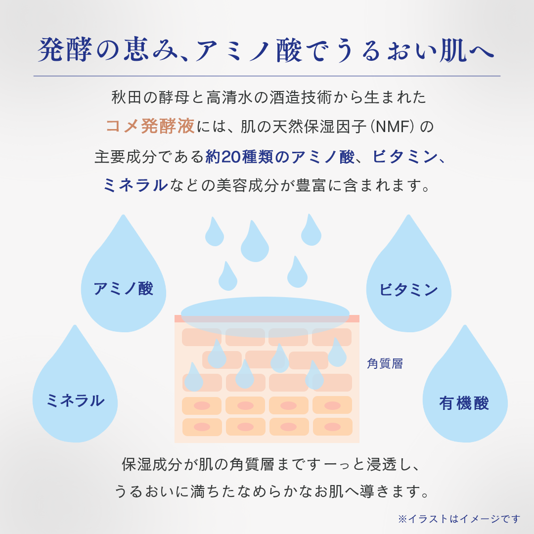 これ一つでぜいたく保湿 美人の故郷・秋田で丹精込めて造られた高清水の純米酒(コメ発酵液)や、秋田県産の美肌成分を配合。ぷるんとしたみずみずしいジェルが角質層まで浸透し、これ一つでしっかり保湿。季節を問わず使いやすい高機能オールインワンジェルです。
